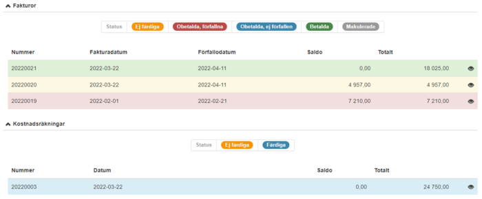 - Vi har även gjort kundbilden inne på registret mer överskådlig. Nu visas alla fakturor/kostnadsräkningar/offerter inne på kundbilden. Vi har även färgkodat dessa för att ge en tydligare översikt.