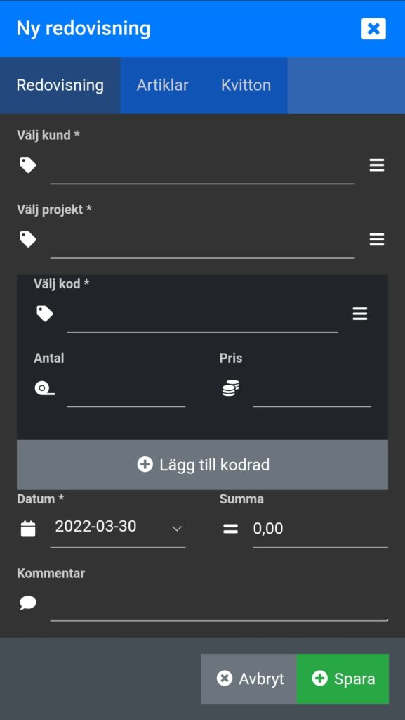 - Nu har vi lagt till möjligheten i Mobilappen att lägga till kodrader, när ni skapar en redovisning. Detta har tidigare bara varit möjligt i webbläsaren och underlättar när ni behöver redovisa flera åtgärder med olika koder samma dag.