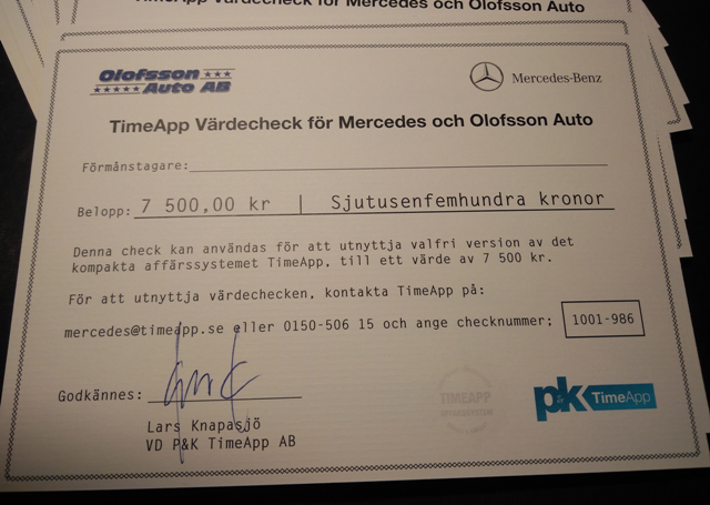 Sedan en tid tillbaka har Mercedes-återförsäljaren Olofsson Auto AB ett samarbete med TimeApp. Det innebär att om du köper en Mercedes – oaktat personbil, buss eller pickup – får du en värdecheck på TimeApp på inte mindre än 7 500 kronor. Det motsvarar ungefär 55,5 månadsabonnemang med nuvarande prissättning; 135 kronor per användare/månad.