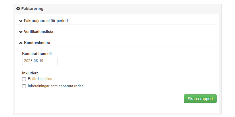 Den nya rapporten går att finna under menyn Rapporter och sedan Fakturering. Den tar ut fullständig information över det som finns inlagd, under den valda tidsperioden.