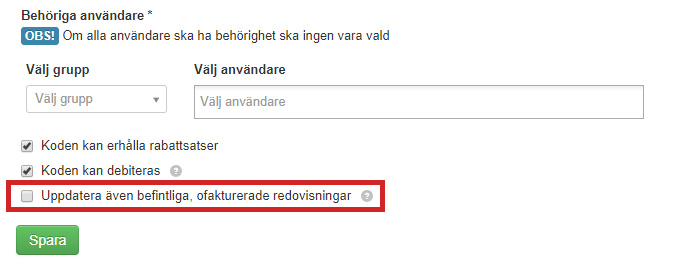 Prisuppdateringarna genomförs genom att man ändrar priset på någon av sina befintliga koder. I redigeringsläget för koden finns en ny kryssruta med texten “Uppdatera även befintliga, ofakturerade redovisningar”. För att uppdatera priser bakåt i tiden, behöver denna vara ikryssad när man sparar prisändringarna på koden.