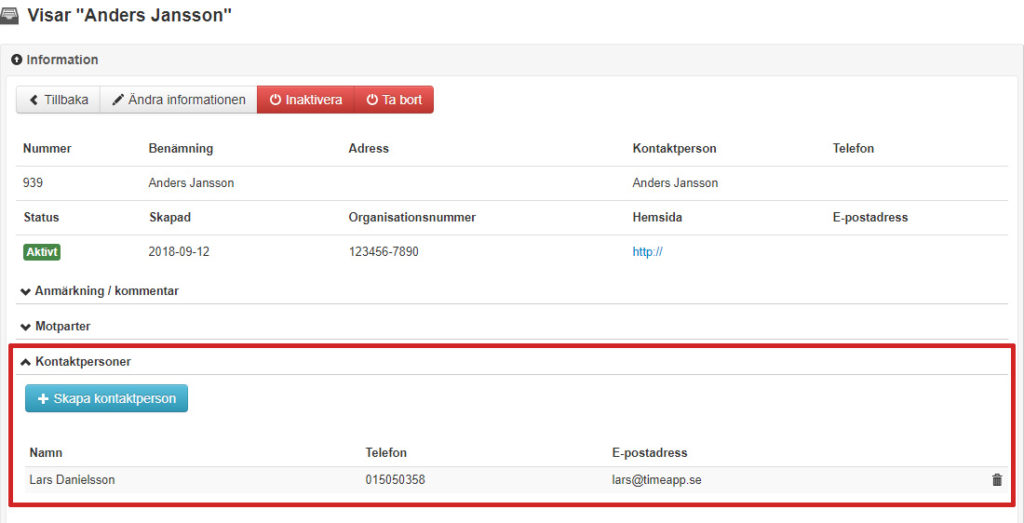 Varje klient kan nu ha flera kontaktpersoner. Dessa läggs enkelt till från klientens sida i TimeApp. Varje kontaktperson är också inkluderad i jävssökningar.