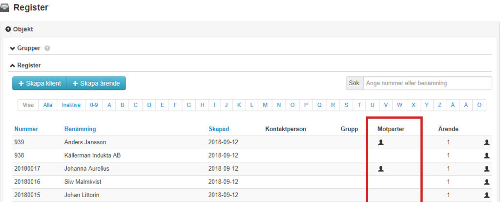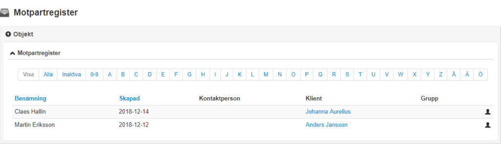 Motpartregistret är, precis som det låter, ett separat register över motparter. Motparten registreras direkt från klientens sida i TimeApp och är sedan sökbar i jävsammanhang.