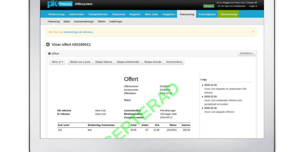 Man kommer inom kort att kunna skapa offerter direkt i TimeApp. När man sedan får offerten accepterad av kunden, kommer man att kunna omvandla denna offert till en arbetsorder eller ett projekt i TimeApp.
