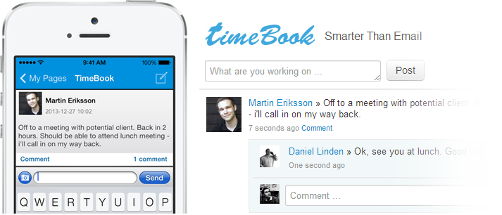 TimeBook, som är en av funktionerna i TimeApp, är ett internt socialt forum för just ert företag.