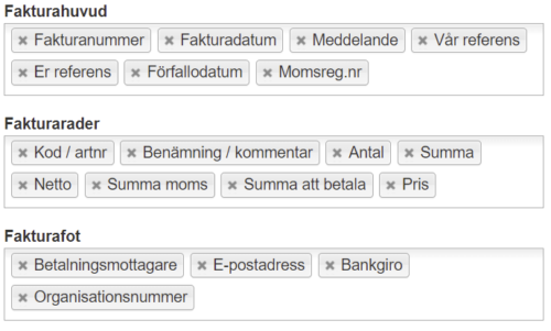Om ni vill ha en grund att utgå ifrån, brukar dessa inställningar på fakturamallen vara vanligast för de kunder som vi på supporten tidigare har hjälpt med att ställa in;